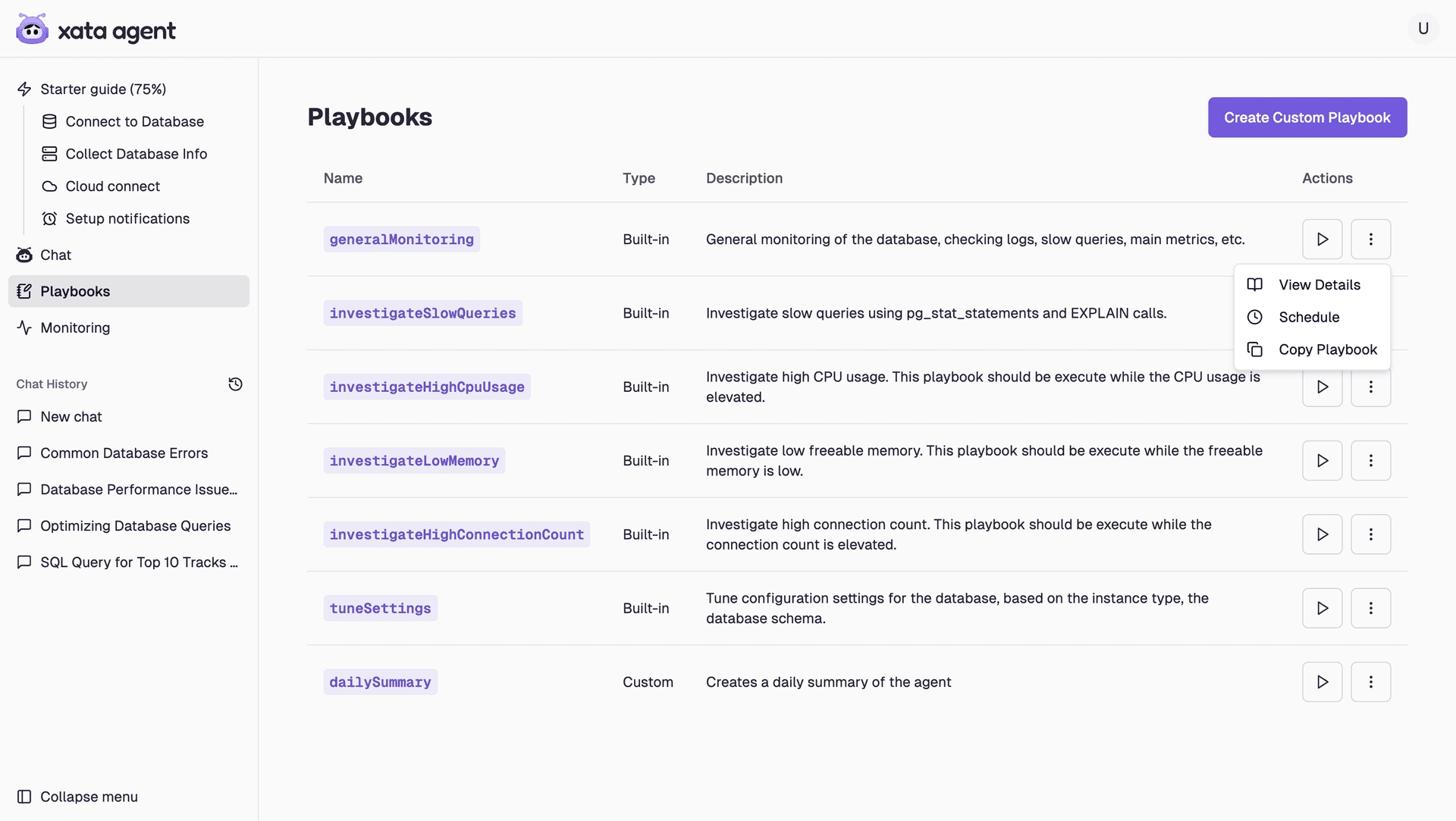 Playbooks: The operational “recipes” that define how to detect, diagnose and resolve issues. The Agent comes with a handful of pre-built playbooks that cover common PostgreSQL scenarios but we also but we also recognize that every company, business and database is unique. That’s why we support custom playbooks, giving you the ability to create your own, fork one of ours, or even generate them from natural language. This is the first step in building a library of workflows tailored to your environment. Looking ahead, we’re working on custom tools via MCP and envision an agent that can author and refine its own playbooks over time.