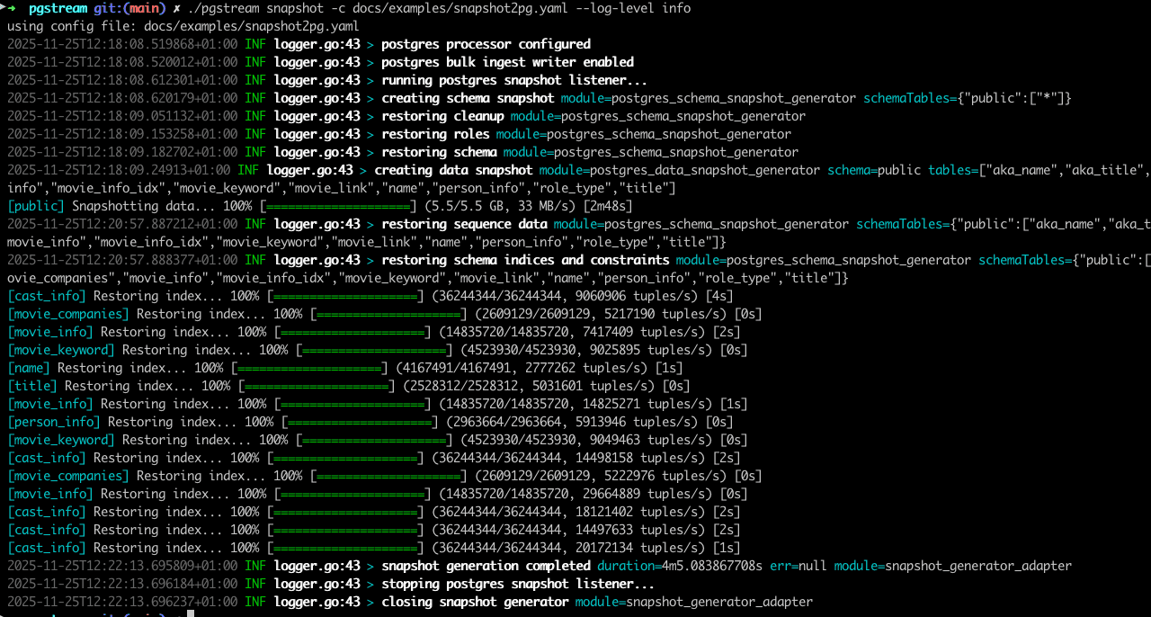 Snapshots are often the first pain point when adopting CDC, especially on large datasets. One of the biggest issues during large snapshots is the lack of observability into progress. pgstream already tracks data progress, but schema operations such as index creation rely on pg_dump / pg_restore under the hood, which historically gave very little insight into what was happening.